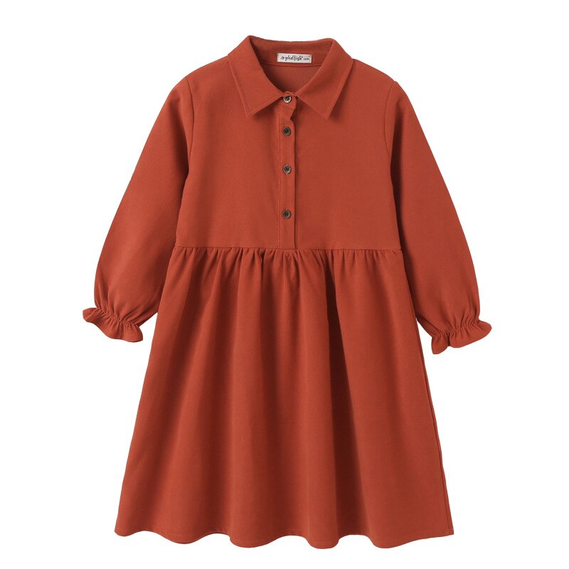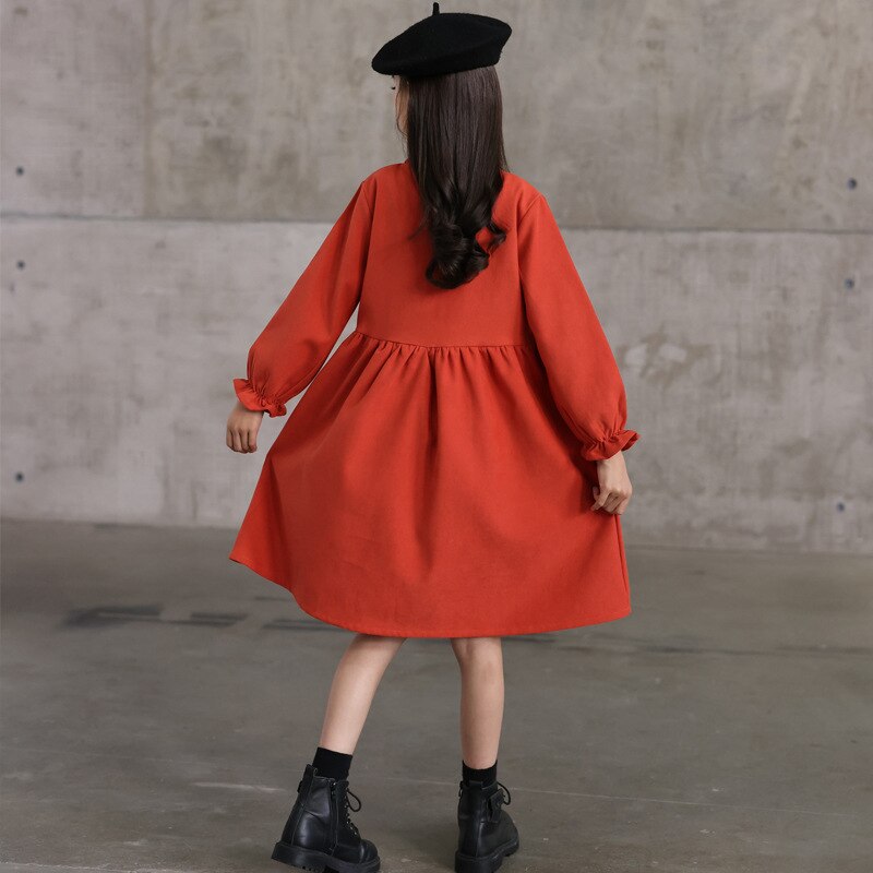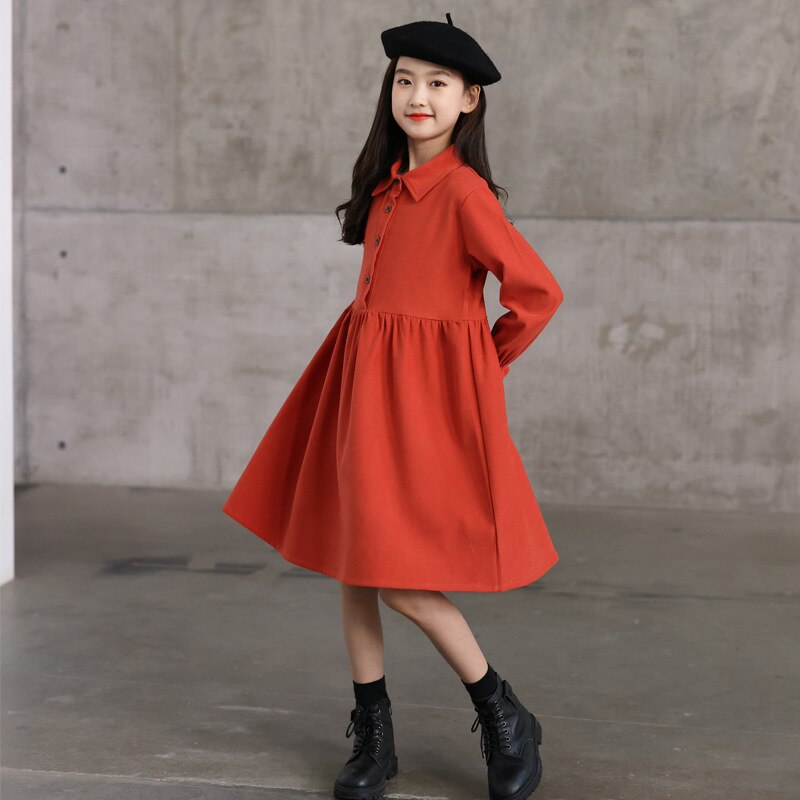 Autumn Dress for New Year 2022 Kids Girls Shirt Collar Long Sleeve Dresses Teenage Turn-down Collar Sold Color Button Costumes