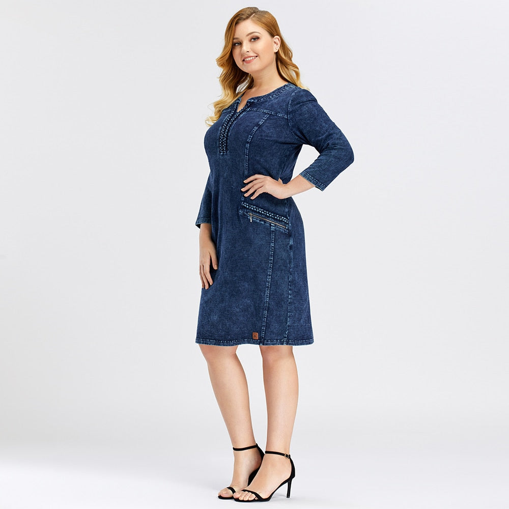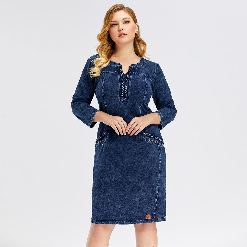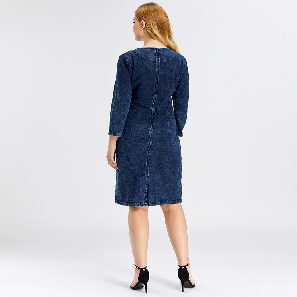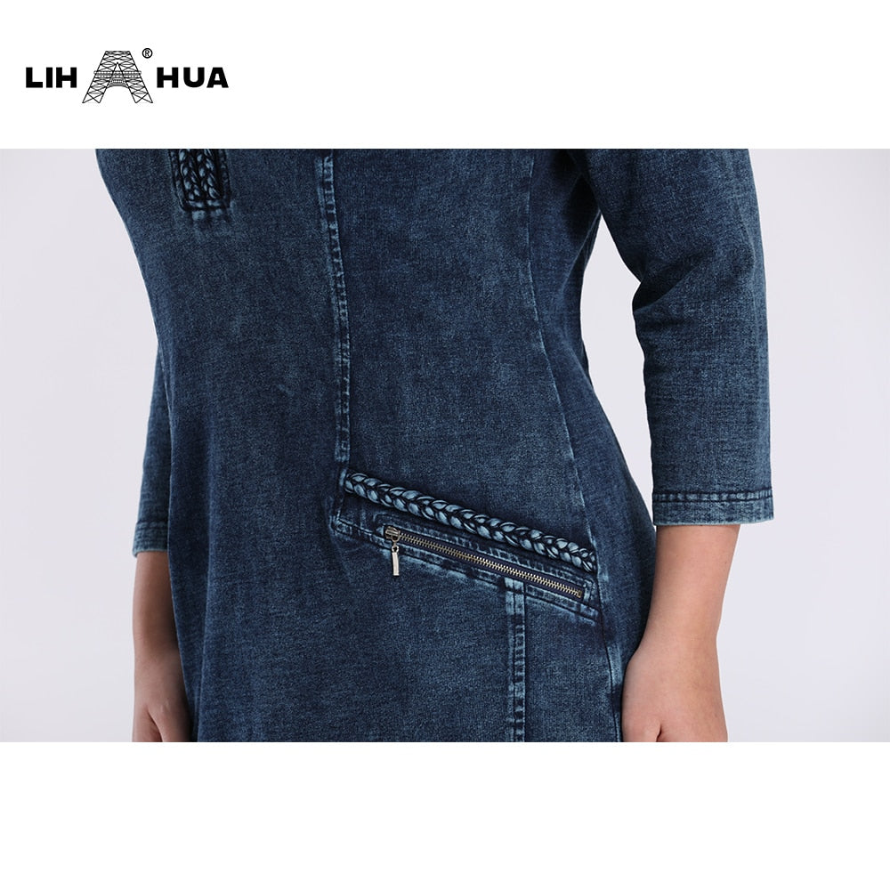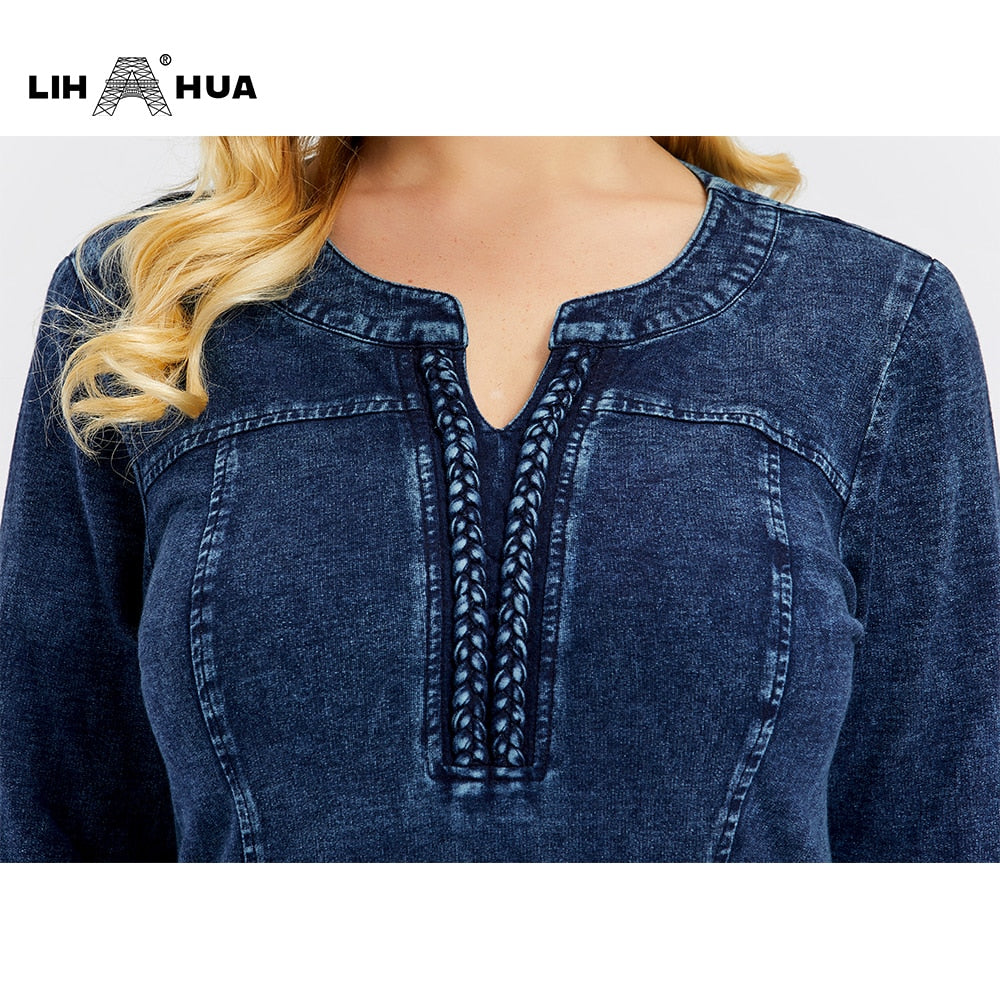 LIH HUA Women's Plus Size Denim Dress Elasticity Knitted Denim Dresses Slim Fit Casual Dress Shoulder Pads Midi Dress
