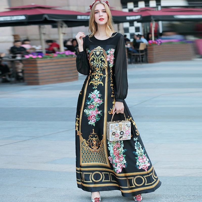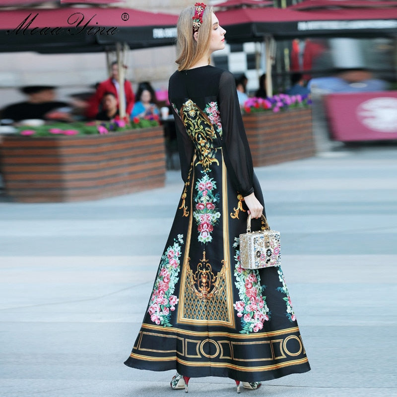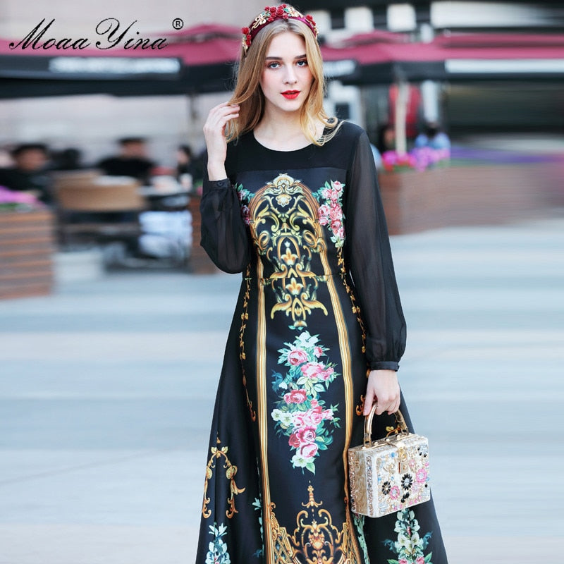 MoaaYina Fashion Designer dress Spring Women's Dress Long sleeve Vintage Floral-Print Black Maxi Dresses