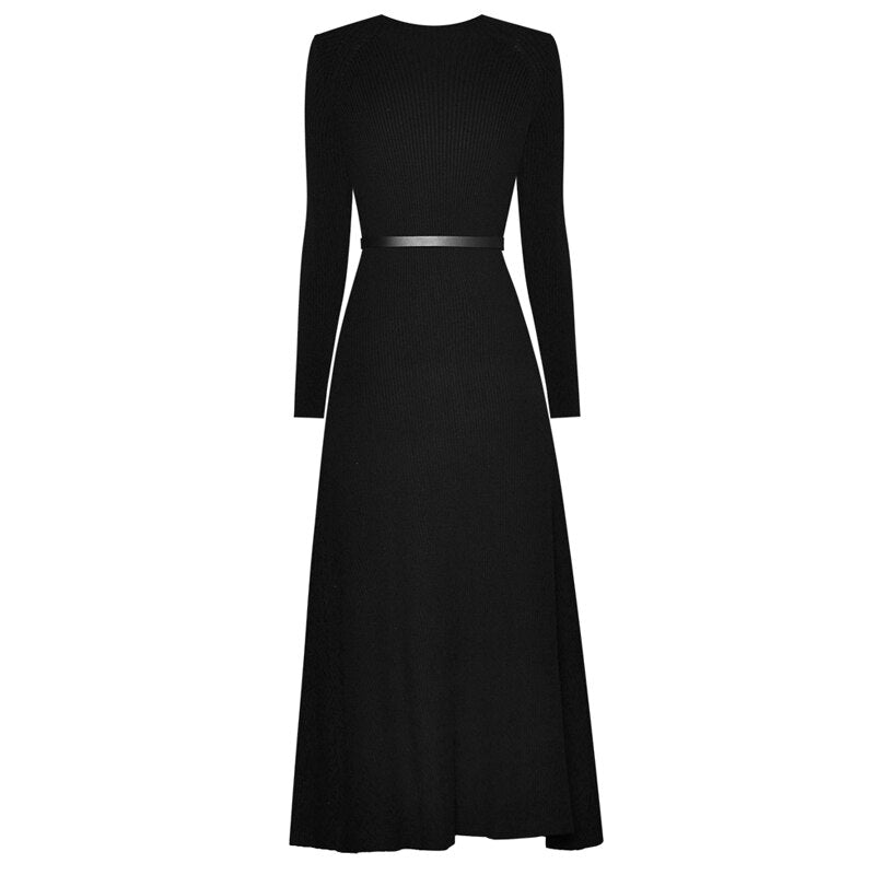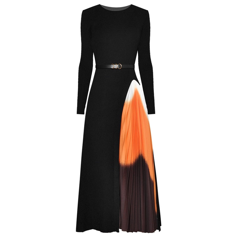 SEQINYY Midi Elegant Dress 2020 Autumn Winter New Fashion Design Women Black Knitting Spliced Orange Print Pleated Casual