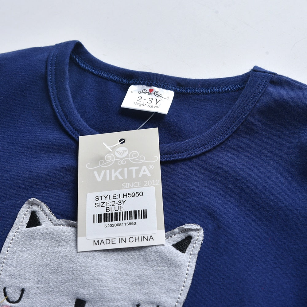 VIKITA Girls Cotton Dress Kids Cartoon Appliqued Vestidos Children Casual Wear Clothes Girls Long Sleeve Patchwork Dresses