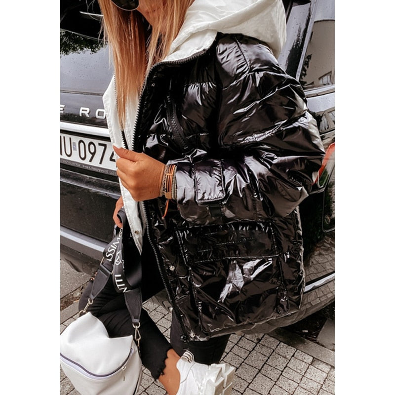 Winter Shiny Hooded Coat Women Long Sleeve Zipper Casual Street Style Bomber Jacket Thick Warm Parka Outerwear 2021