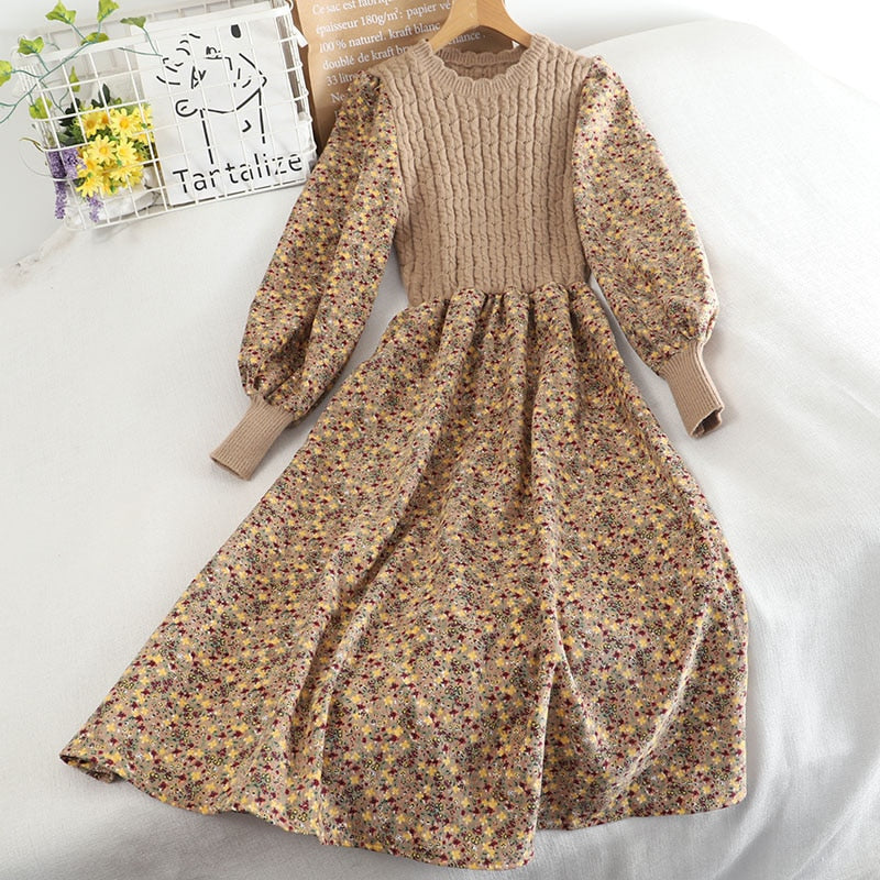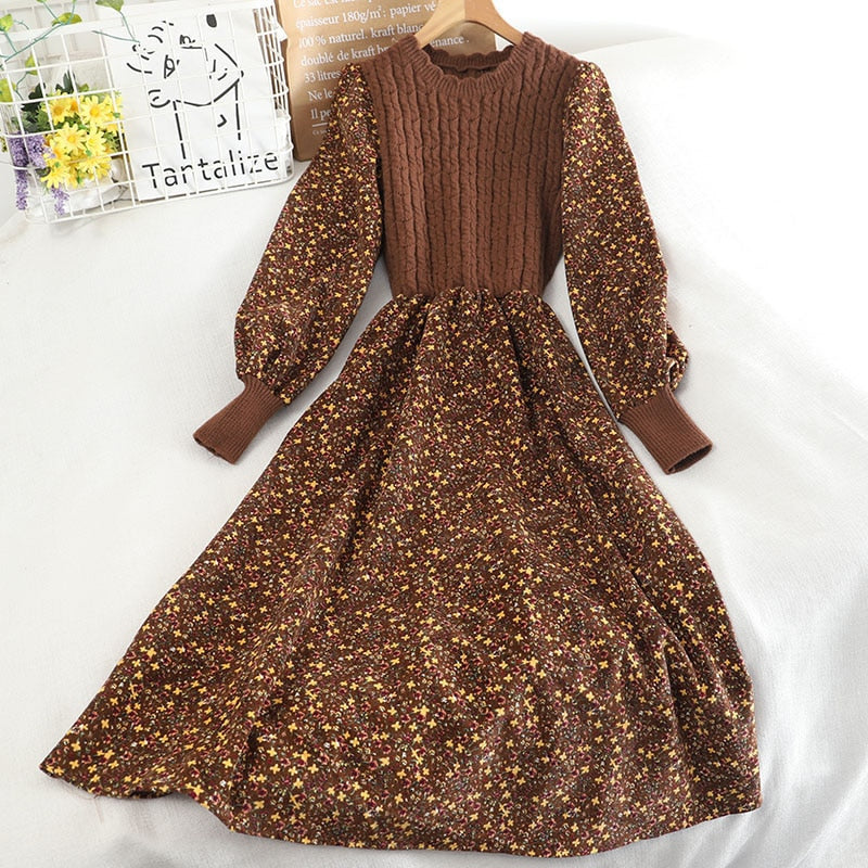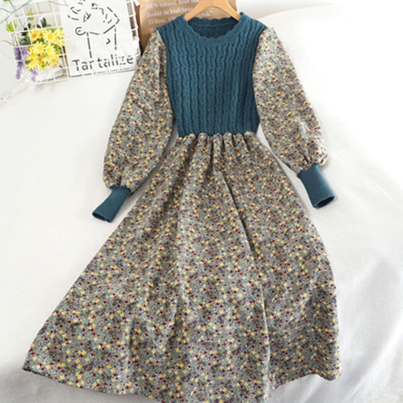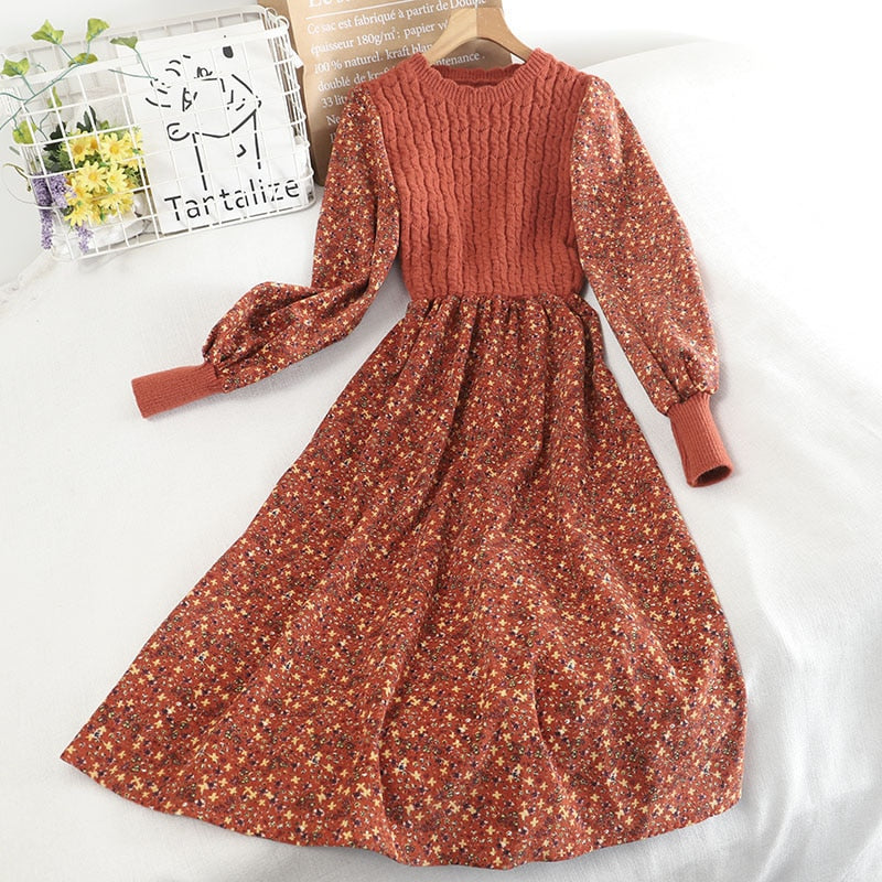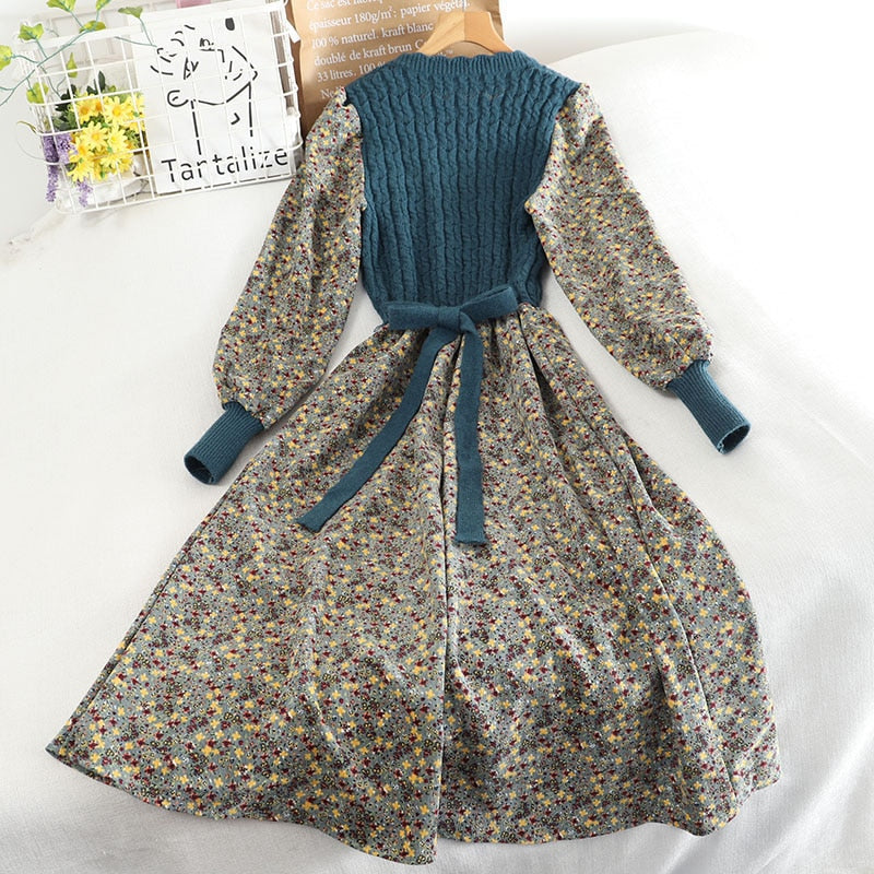 Women's Knitted Dress Autumn Winter New Long Sleeve Corduroy Floral Dress Female Elegant Sweater A-line Long Veatidos Belt