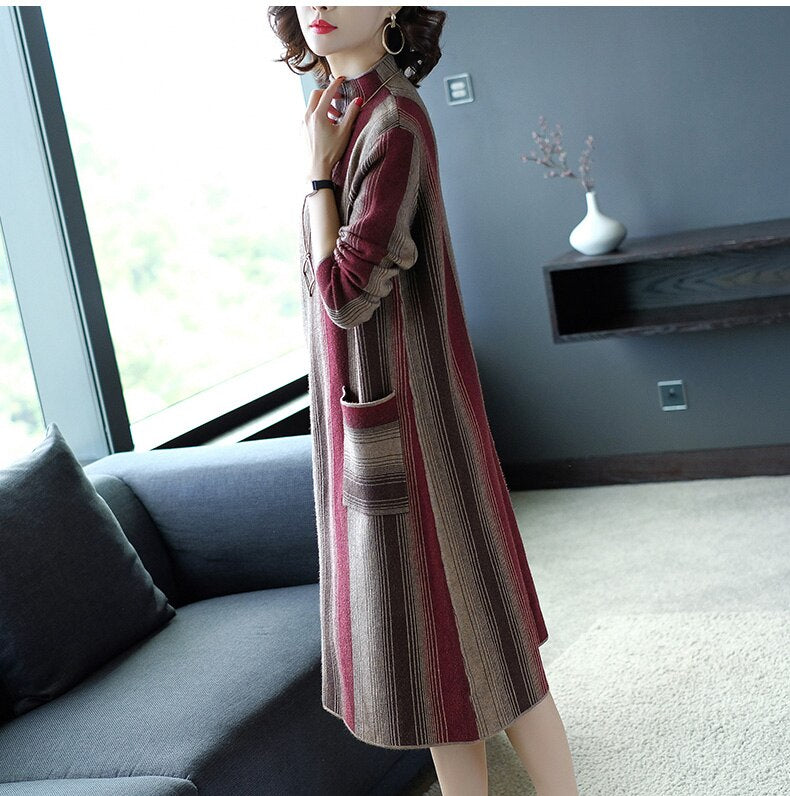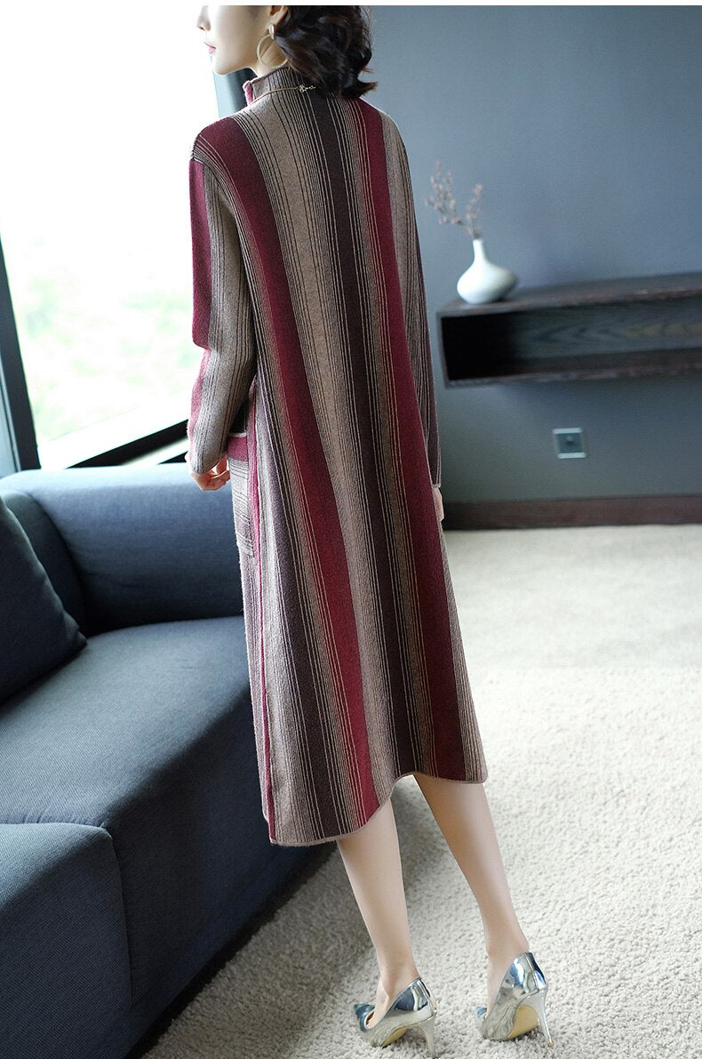 ZUOMAN Autumn Office Turtleneck Knitted Dress for Women Elegant Striped Sweaters Dresses Long Sleeves Female A-line Winter Dress